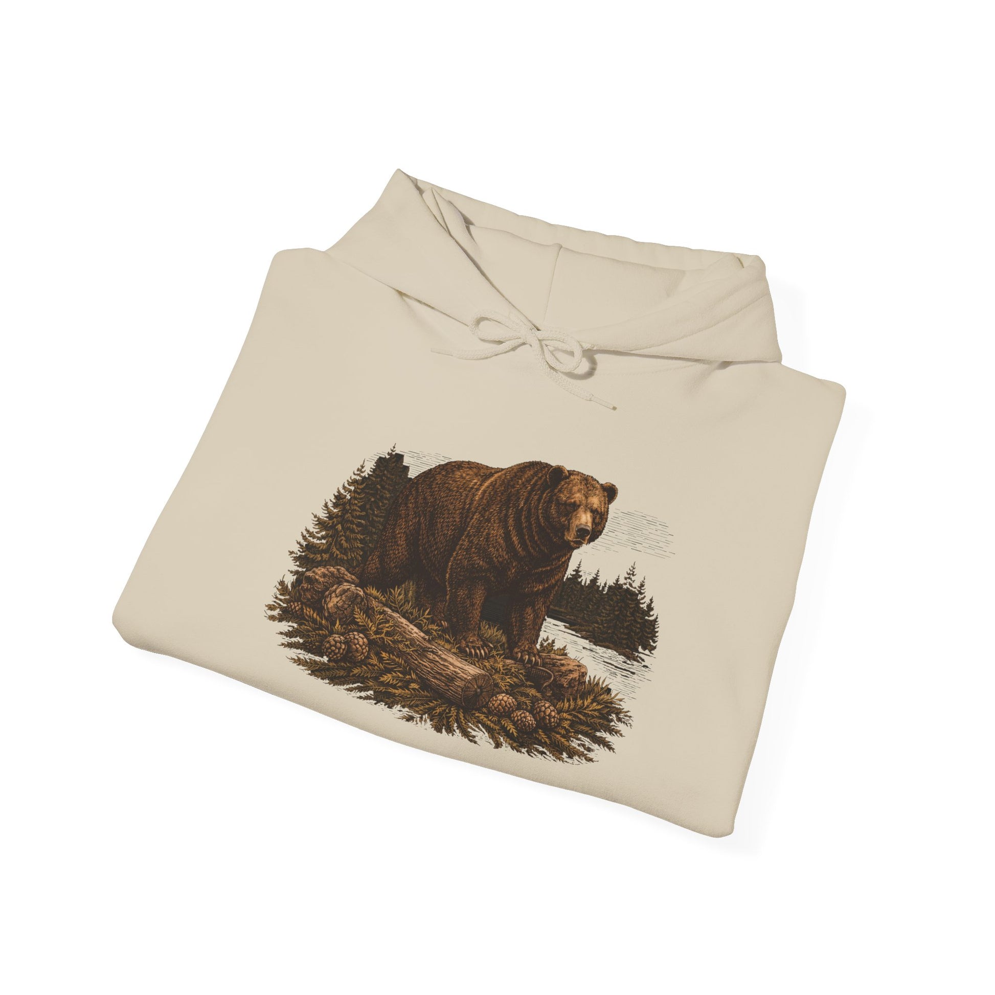 This cozy hooded sweatshirt carries a quiet outdoorsy spirit — a grounded, earthy bear artwork rests across the chest, pulling you back to riverside mornings and mossy trails. The mid-weight fabric and classic fit wrap you in warmth without feeling bulky. A roomy kangaroo pocket keeps hands warm or stores essentials, while the double-lined hood and color-matched drawcord add a tailored, durable finish. Wear it on cool dawn hikes, around a cabin fire, or while running weekend errands — it’s made to be lived in and loved by folks who favor simple, nature-driven style.