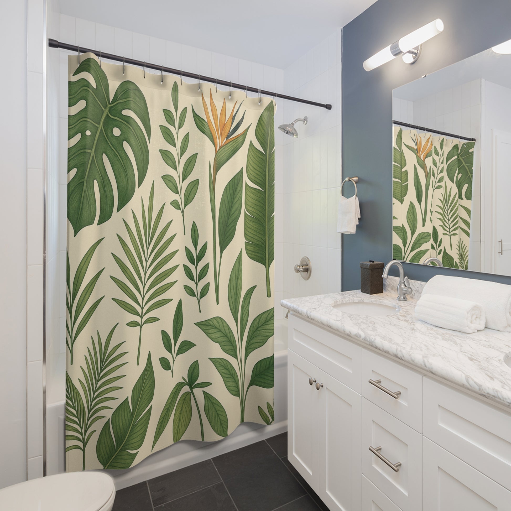 Bring a calm, leafy sanctuary into your bathroom with this botanical shower curtain. Soft, painterly green leaves and a single bird-of-paradise bloom float across a warm, cream background, creating a relaxed, nature-forward atmosphere. The lightweight polyester hangs smoothly, dries quickly, and keeps the design vibrant on one side while resisting wrinkles. It’s the kind of piece that turns a quick morning routine into a quiet pause—where sunlight feels warmer and the room breathes a little easier. Hang it on days when you want your space to feel fresh, plant-filled, and gently curated.