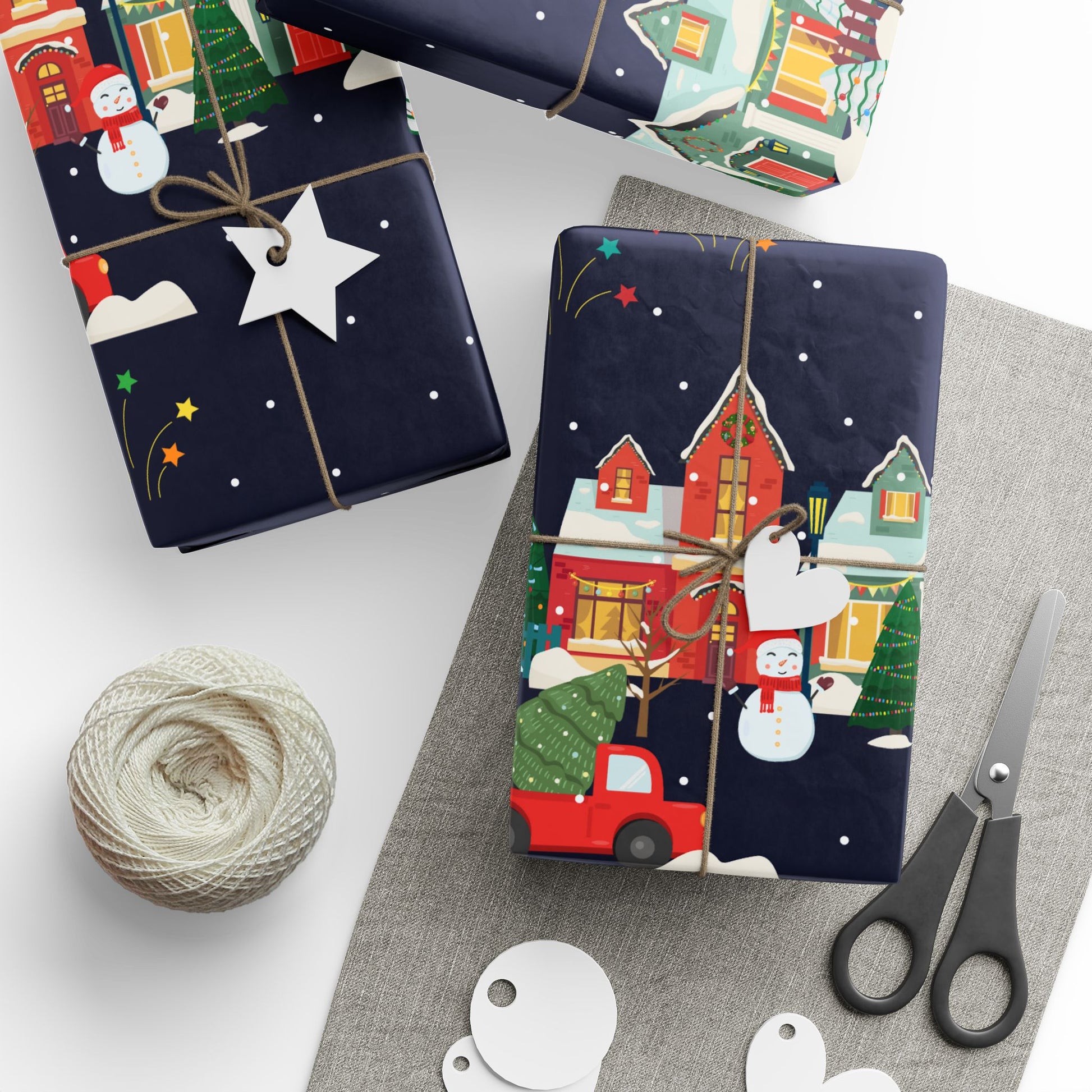 Lose yourself in a cozy, snowy neighborhood with this festive wrapping paper. Deep navy backgrounds make the colorful houses, vintage red truck, and cheerful holiday trees pop—each scene feels like a quiet winter evening with softly falling snow. The high-definition print and thick fine art paper give each gift a tactile, crafted quality that complements thoughtful presents. Roll it out for holiday gatherings, secret Santa exchanges, or when you want to make a winter birthday feel extra warm and nostalgic.