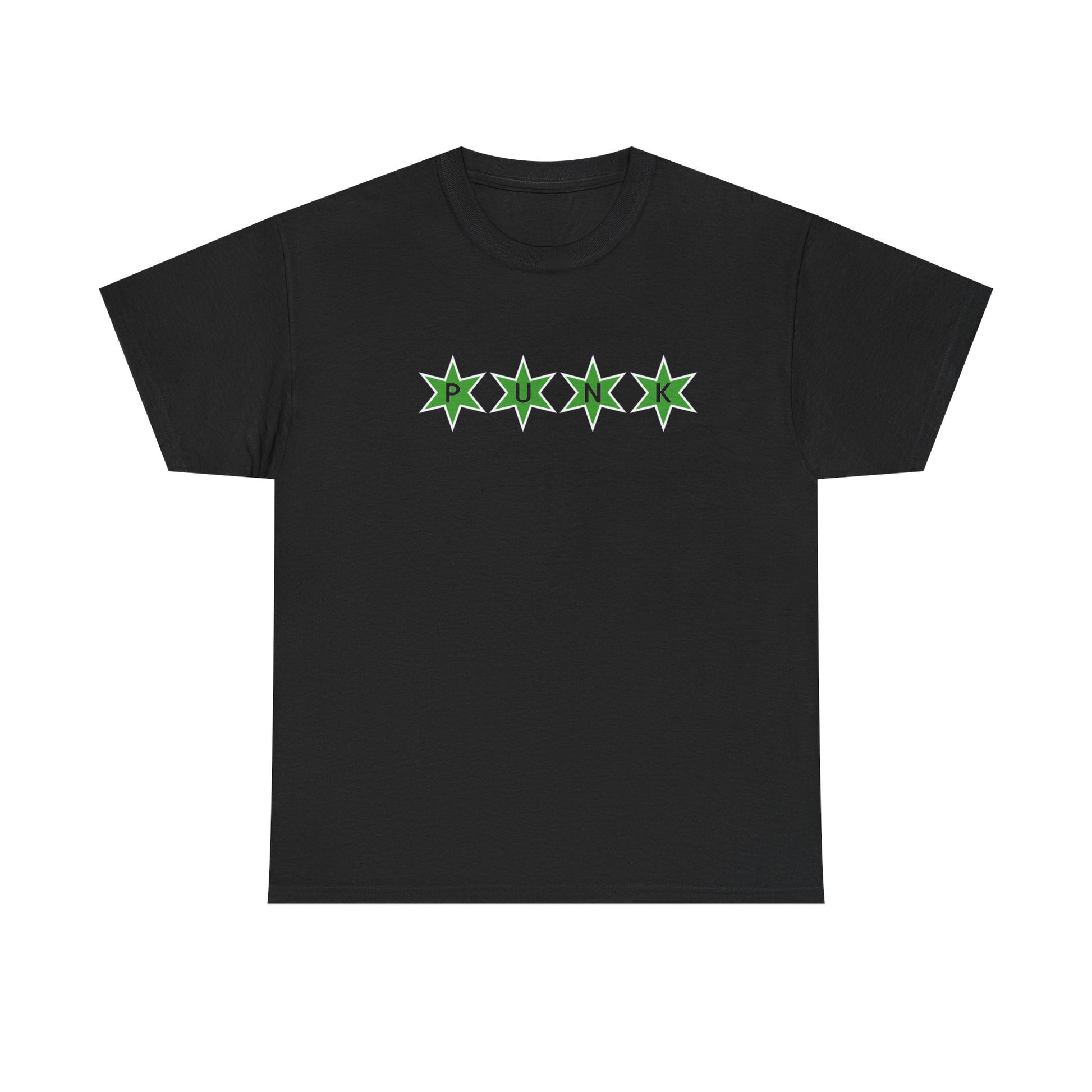Wear your green-energy attitude with subtle confidence. This relaxed-fit tee features a neat row of five lime-green stars across the chest, each star outlined for a crisp, slightly vintage badge look. The design sits low on the chest so it reads cleanly under jackets or when worn solo. Lightweight but durable cotton keeps the tee breathable on busy days and steady through repeated washes. It’s a quiet statement piece for someone who likes tidy graphics, a touch of retro playfulness, and clothing that moves with their everyday life.
