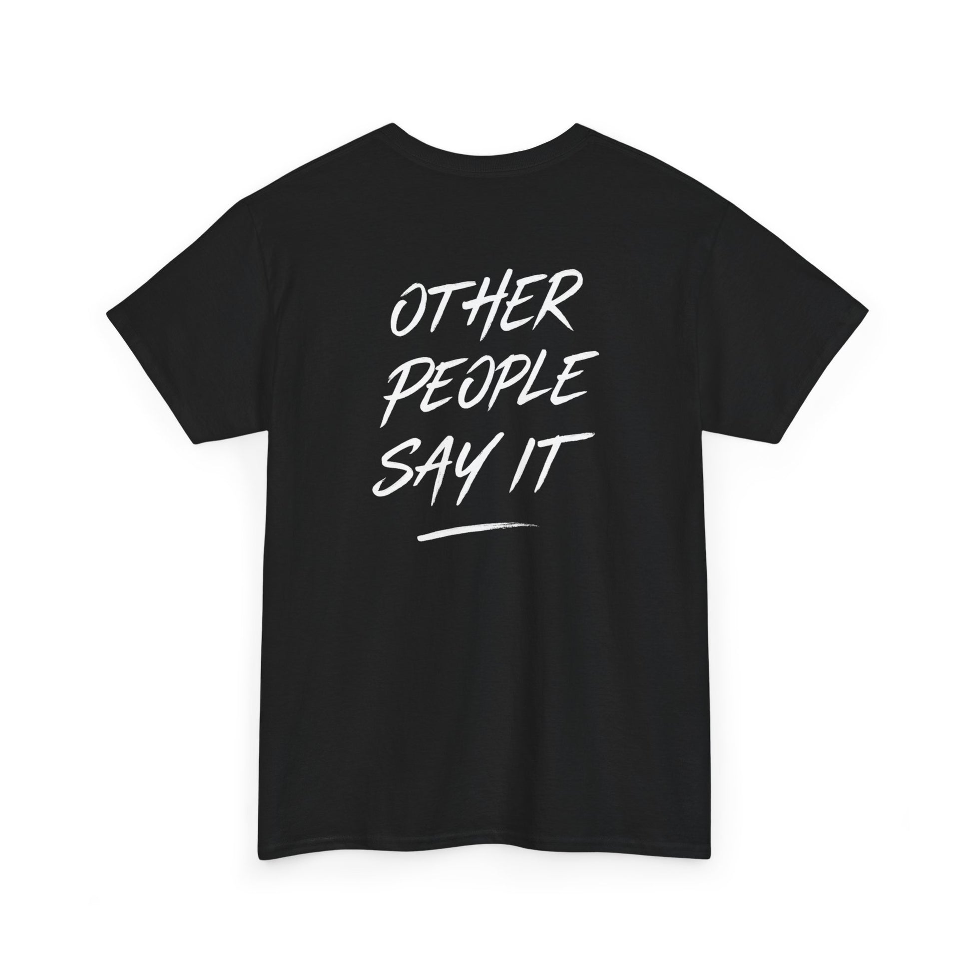 A bold, no-nonsense tee that speaks with voice and attitude. The black crewneck carries a hand-lettered white message — “IT’S NOT JUST ME SAYING IT OTHER PEOPLE SAY IT” — that reads like the exhale after a conversation that needed saying. Wear it layered under a denim jacket or alone with worn-in jeans to start a grin, a debate, or a knowing nod from someone who gets it. The shirt sits square and relaxed on the body, letting the statement be the centerpiece without shouting. Built for repeated wears and washes, it keeps its shape and print clarity while lending an effortless edge to everyday outfits.