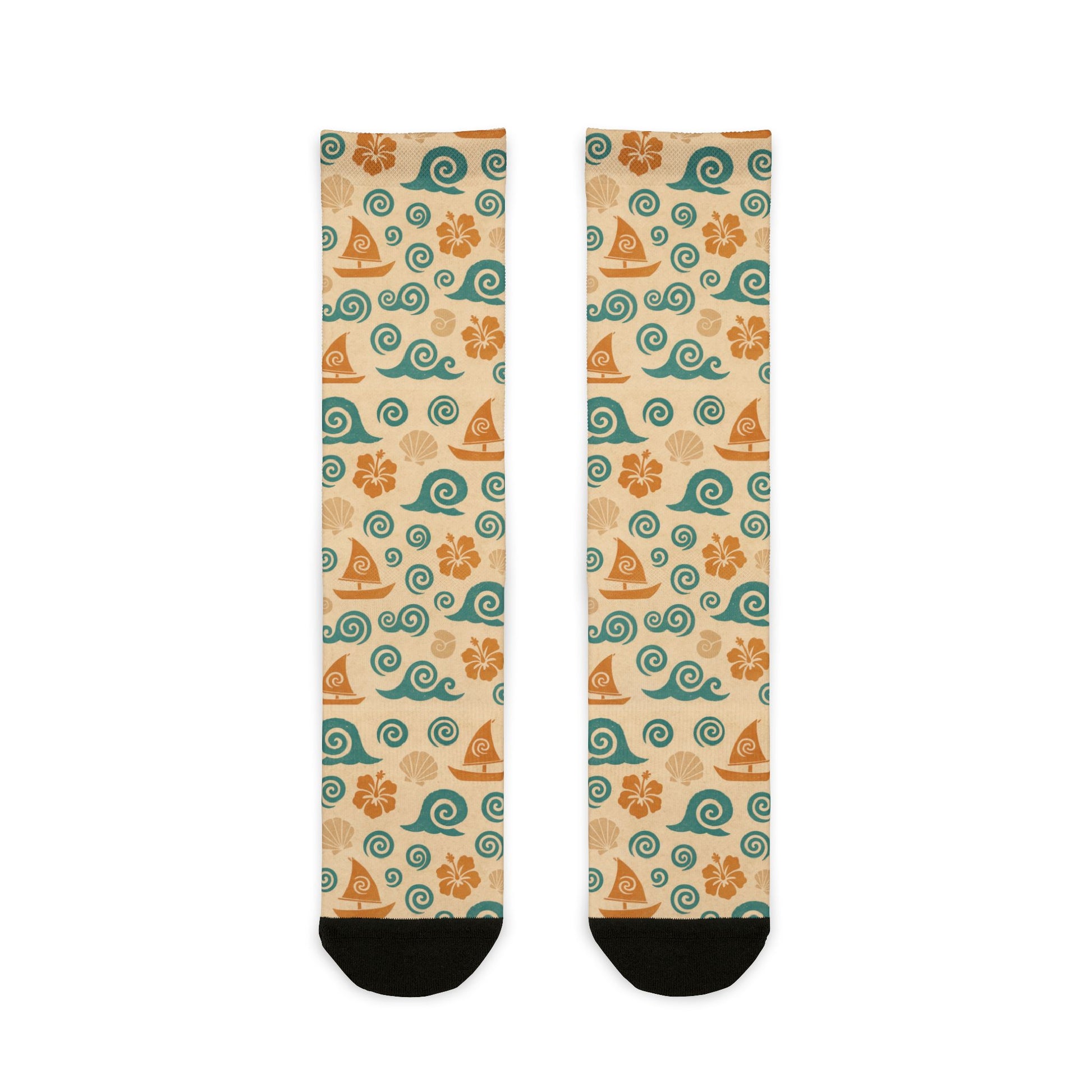 These crew socks bring a playful, sunlit beach vibe to everyday wear. Soft, lightweight knit hugs your calves while the full-surface sublimation print shows cheerful sailboats, breezy swirls, and warm florals in sandy and teal hues. Black heels and toes add contrast and durability where it matters, and the stretchy blend keeps the shape after repeated wears. Slip them on for a quick mood lift on a drizzly commute or to carry summer energy through a weekend at home — they read like a small, wearable postcard that says you prefer salt air and slow afternoons.
