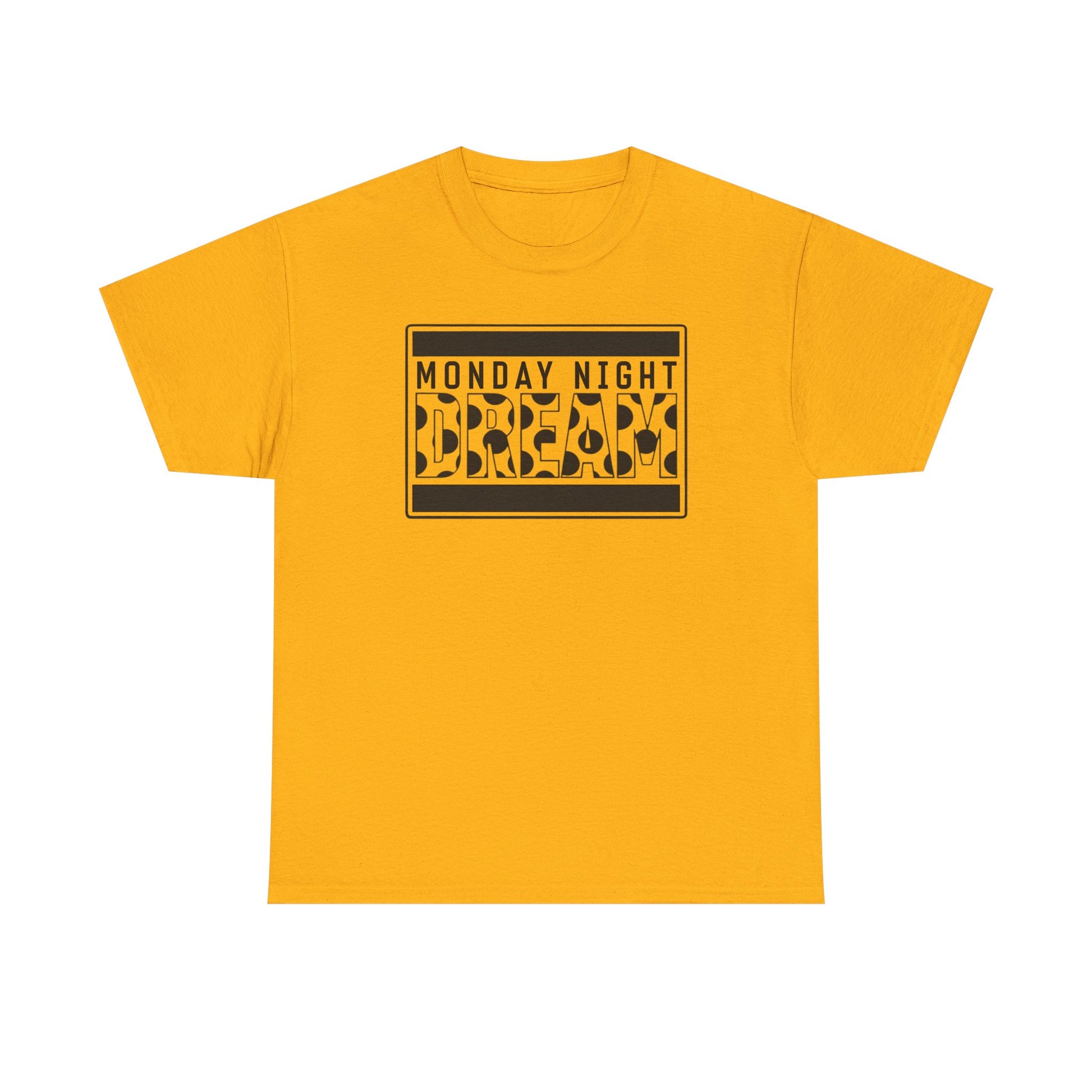 Channel the low-key thrill of late-night sports, underground shows, or friends gathered around a screen — this classic crew tee announces your Monday ritual with bold, vintage-inspired graphics. Soft but sturdy cotton sits close to the body without clinging, while the ribbed collar and reinforced shoulder tape keep the silhouette crisp after many washes. The high-contrast yellow-and-black print pops on dark fabric, giving the shirt an urban, slightly retro edge that reads at a glance: you show up, you watch, you celebrate the weekly ritual. Wear it to kickoff nights, casual meetups, or when you want a simple statement that feels lived-in and real.