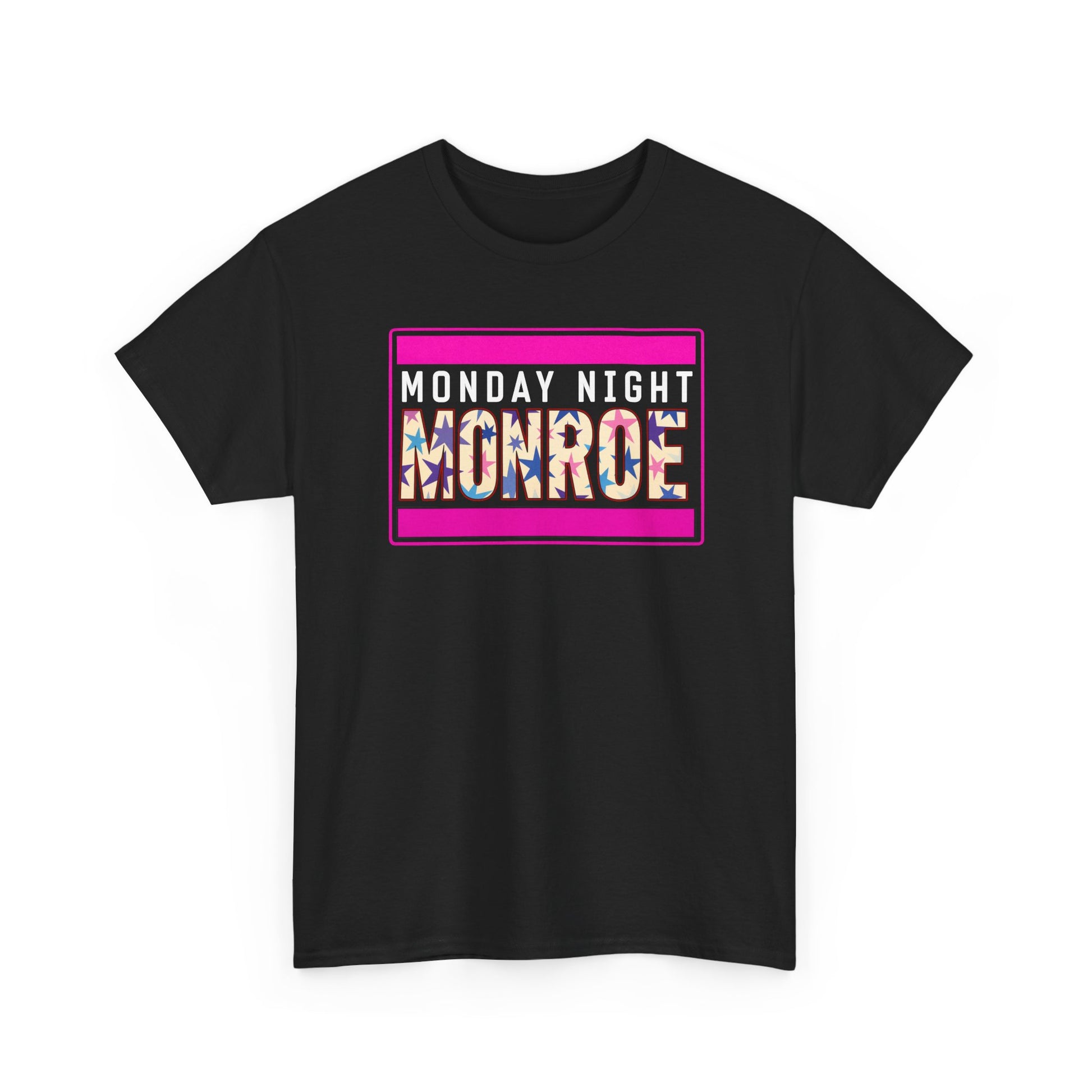 This tee carries neon-soaked nostalgia and loud, unapologetic personality. A bold rectangular chest print reads “MONDAY NIGHT MONROE” in bright pinks and warm florals, framed by a vivid magenta border that pops against deep black fabric. It sits like a statement piece — casual and confident — for anyone who lives for local shows, band nights, or late-night city hangs. The shirt’s relaxed crew neck and classic fit make it easy to throw on before a gig or to wear while grabbing drinks with friends. Small details like a smooth, print-ready cotton surface and tear-away label keep the focus on the artwork and the night you’re making memorable.