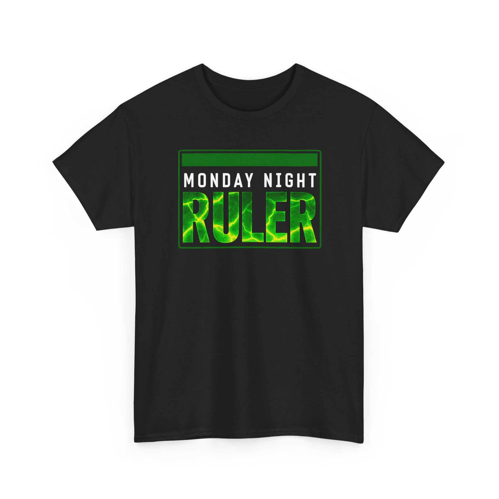 This tee is for nights that feel electric. Bold, neon-green text reads “MONDAY NIGHT RULER” across the chest, a shout of confidence that turns an ordinary evening into something charged. The boxy, classic silhouette sits flat and relaxed — wear it to watch the game, meet friends at a late dinner, or claim your lane on a weekday night out. The graphic’s high-contrast glow pops against the black fabric, so you’re seen without trying too hard. Lightweight but sturdy, it washes and wears like a favorite staple: comfortable in motion, unmistakable in mood.