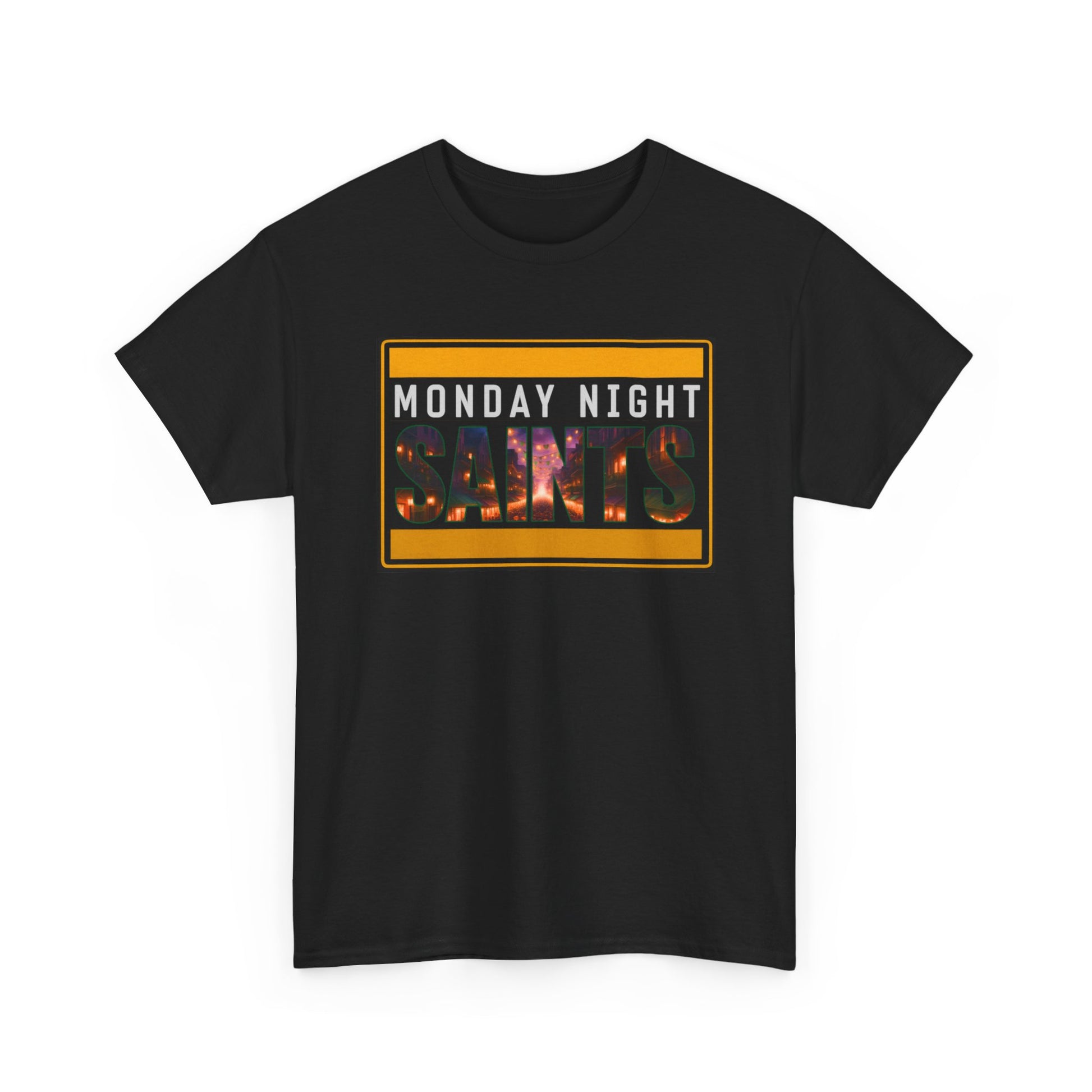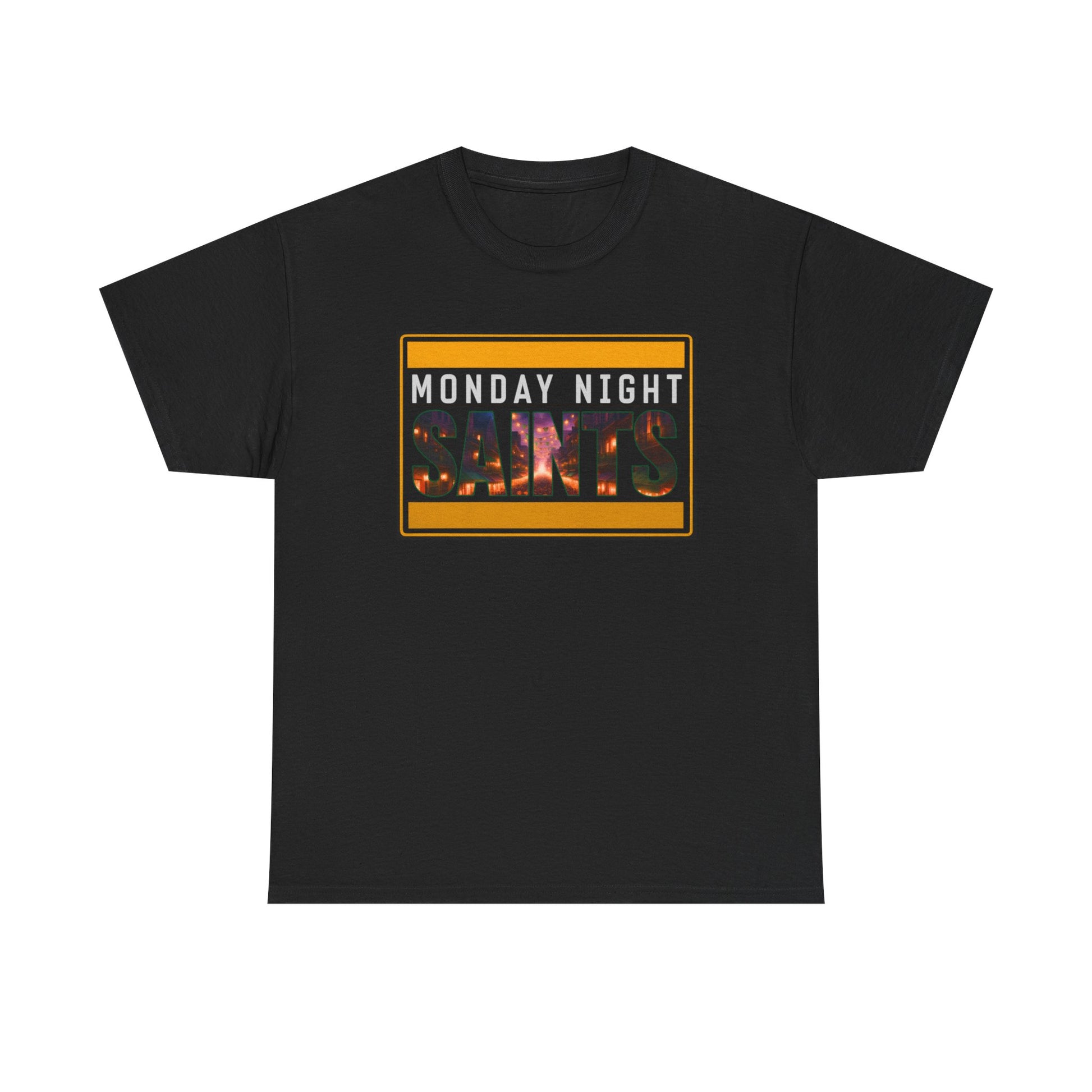 This relaxed crewneck tee carries a retro sports-patch vibe with a sun-washed print that reads “Monday Night SAINTS.” The soft, medium-weight cotton sits with a comfortable drape — broken-in but sturdy — so the graphic looks lived-in without losing its pop. Wear it to low-key game nights, tailgate hangouts, or weekday errands when you want a little hometown pride and vintage energy. The breathable fabric and classic fit make it easy to layer under a flannel or throw on with jeans. Subtle details like a ribbed collar, shoulder tape, and tear-away label keep the shirt feeling polished and comfortable all day.