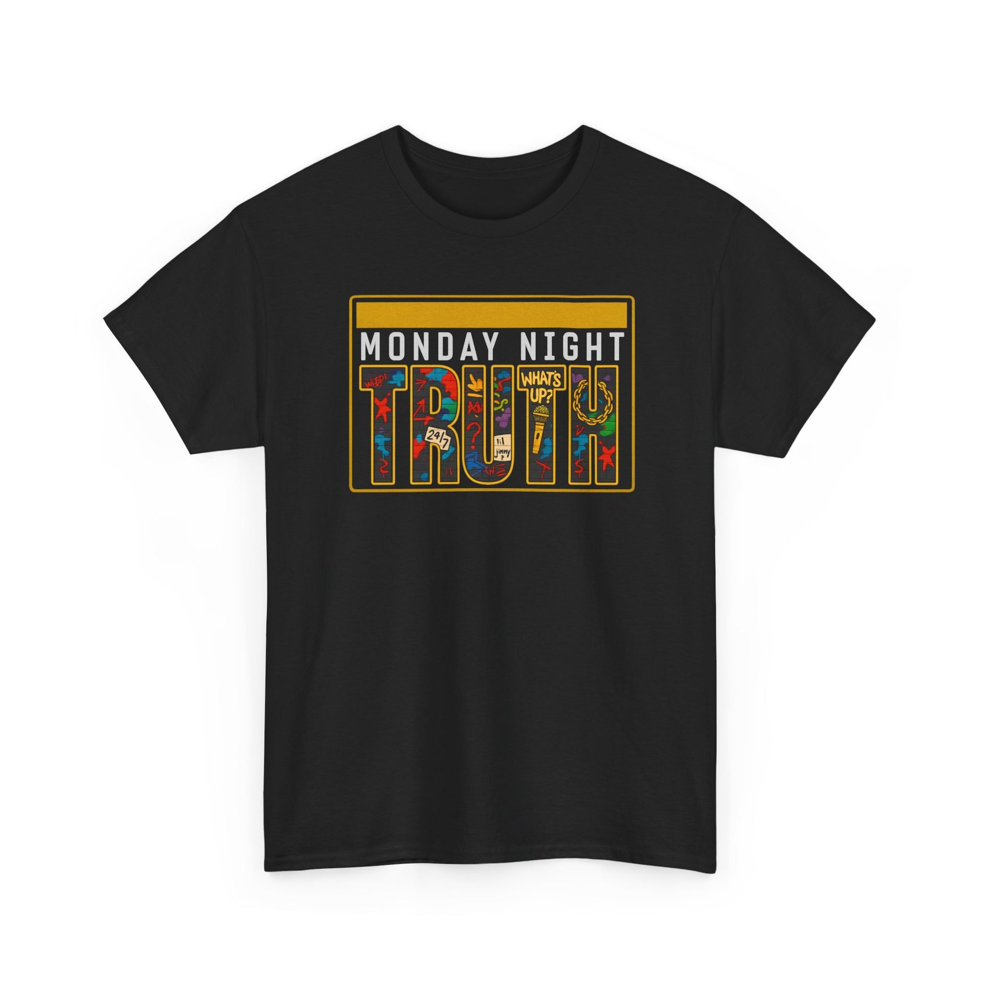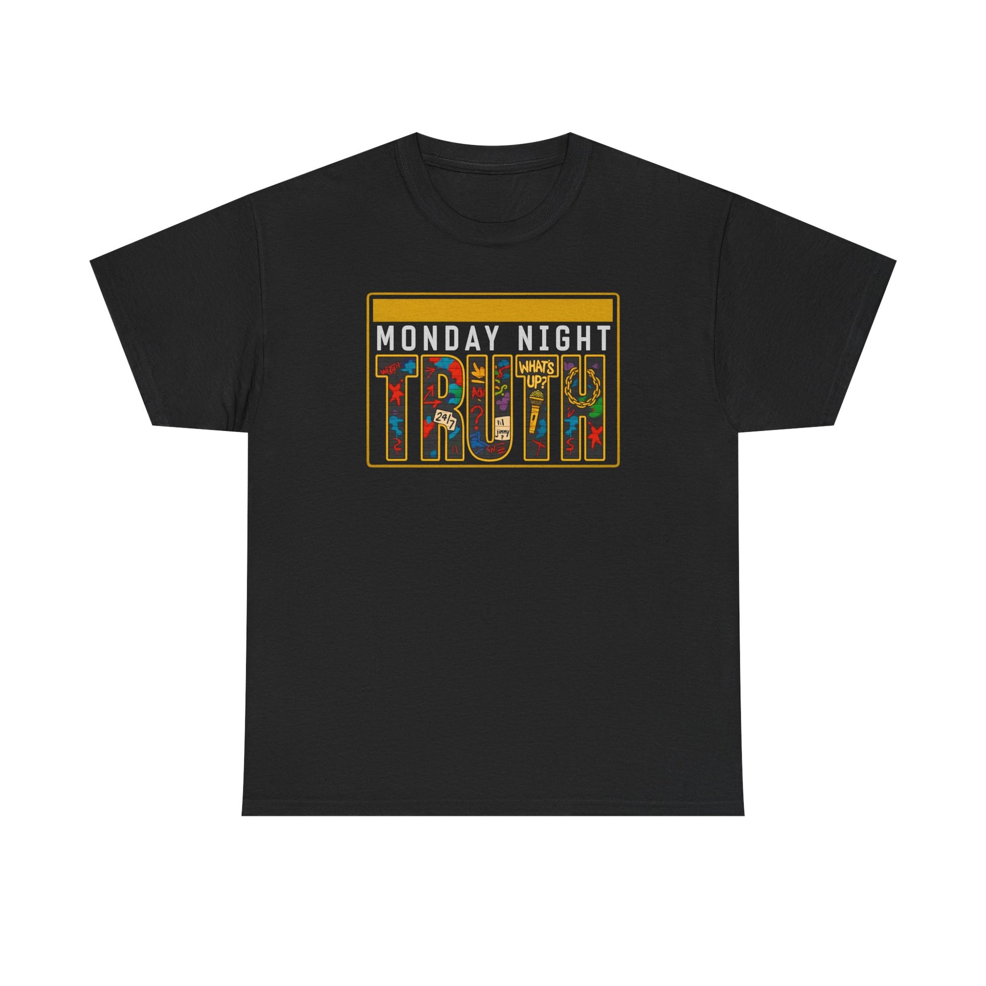 This relaxed-fit cotton tee carries a bold, retro graphic that reads “MONDAY NIGHT TRUTH,” with the word TRUTH filled by a colorful, collage-like pattern. The slightly boxy silhouette and crew neckline make it an easy everyday layer — black fabric lets the warm gold and jewel tones of the print pop. Wear it with worn denim and a beanie for a lived-in, thoughtful look, or layer under a jacket when conversations spill into the night. The shirt feels steady and honest: it’s made to last through repeat wears and washes while keeping its print clear and striking.