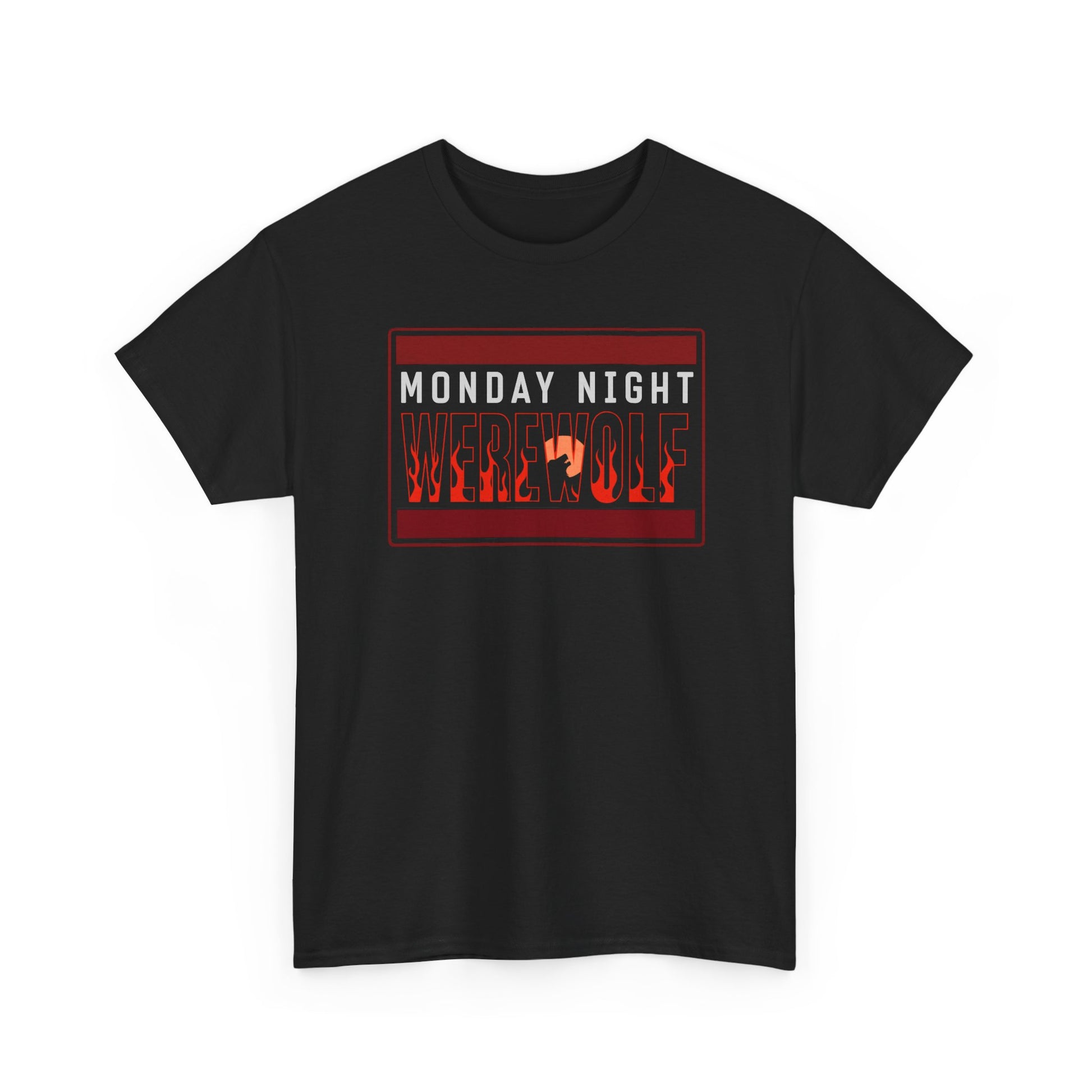 A bold, lived-in tee that channels late-night energy and fandom heat. The black cotton body puts a fiery red-and-white graphic front and center — a gritty “Monday Night” banner with distressed lettering and a snarling wolf silhouette. It feels like the kind of shirt you pull on before a game day watch party, a dive-bar meetup, or a midnight run with friends. The fabric is smooth and durable, the crew neck holds its shape, and the relaxed cut lets you move without fuss. Wear it with a worn denim jacket or under a hoodie when the temperature drops; the graphic reads clear and fierce whether you’re cheering from the couch or walking the city streets.