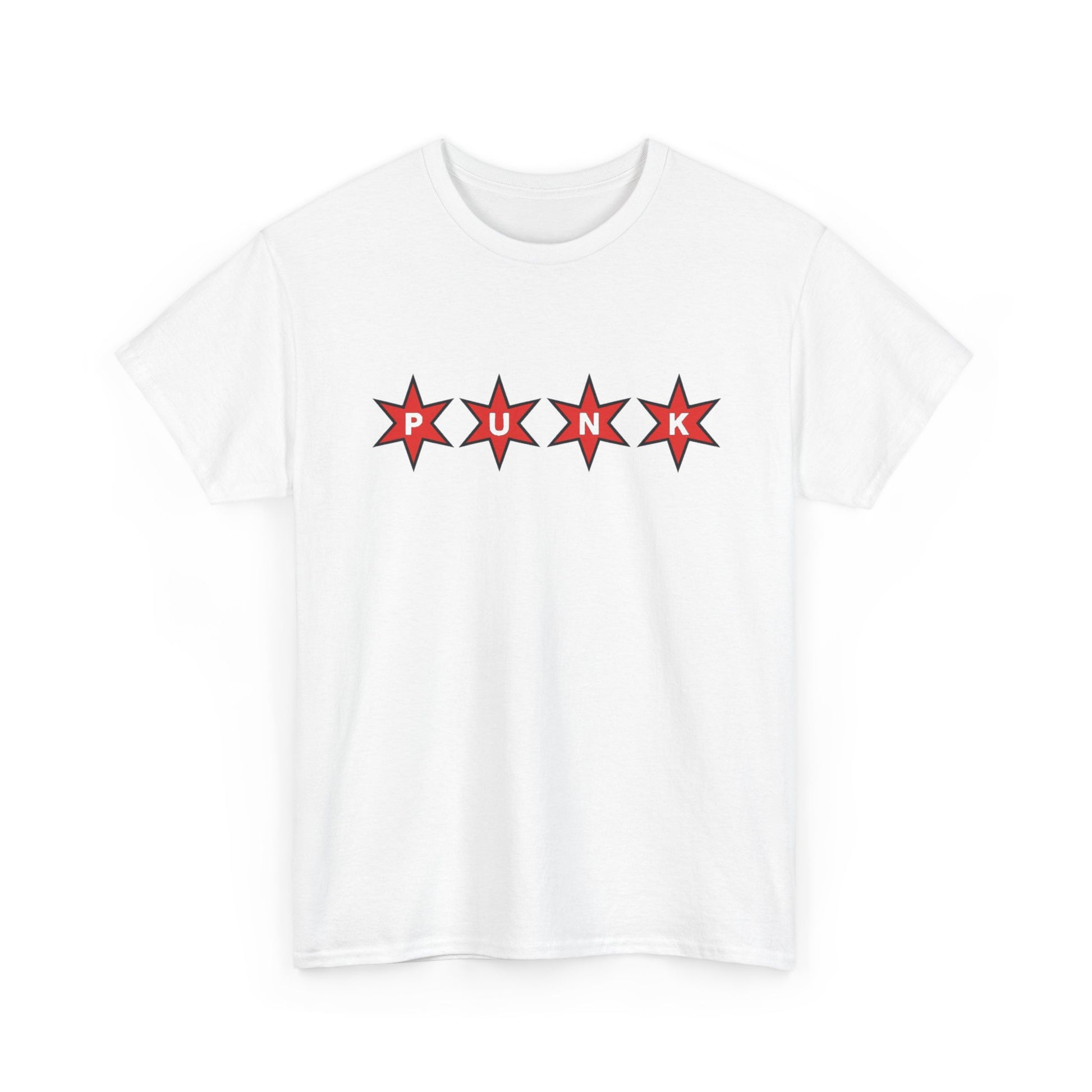 A soft, sturdy tee with a bold, retro-punk vibe — five red starbursts across the chest spell out an attitude rather than a slogan. Lightweight but durable cotton sits close to the body with a classic crew neckline and relaxed fit, so it layers easily under jackets or stands alone as a statement. The clean white canvas lets the red graphic pop, and thoughtful construction (twill shoulder tape, ribbed collar, tear-away label) keeps it comfortable and shape-retaining through repeated wear. Wear it to gigs, weekend city wanderings, or when you want your outfit to speak with a little edge.