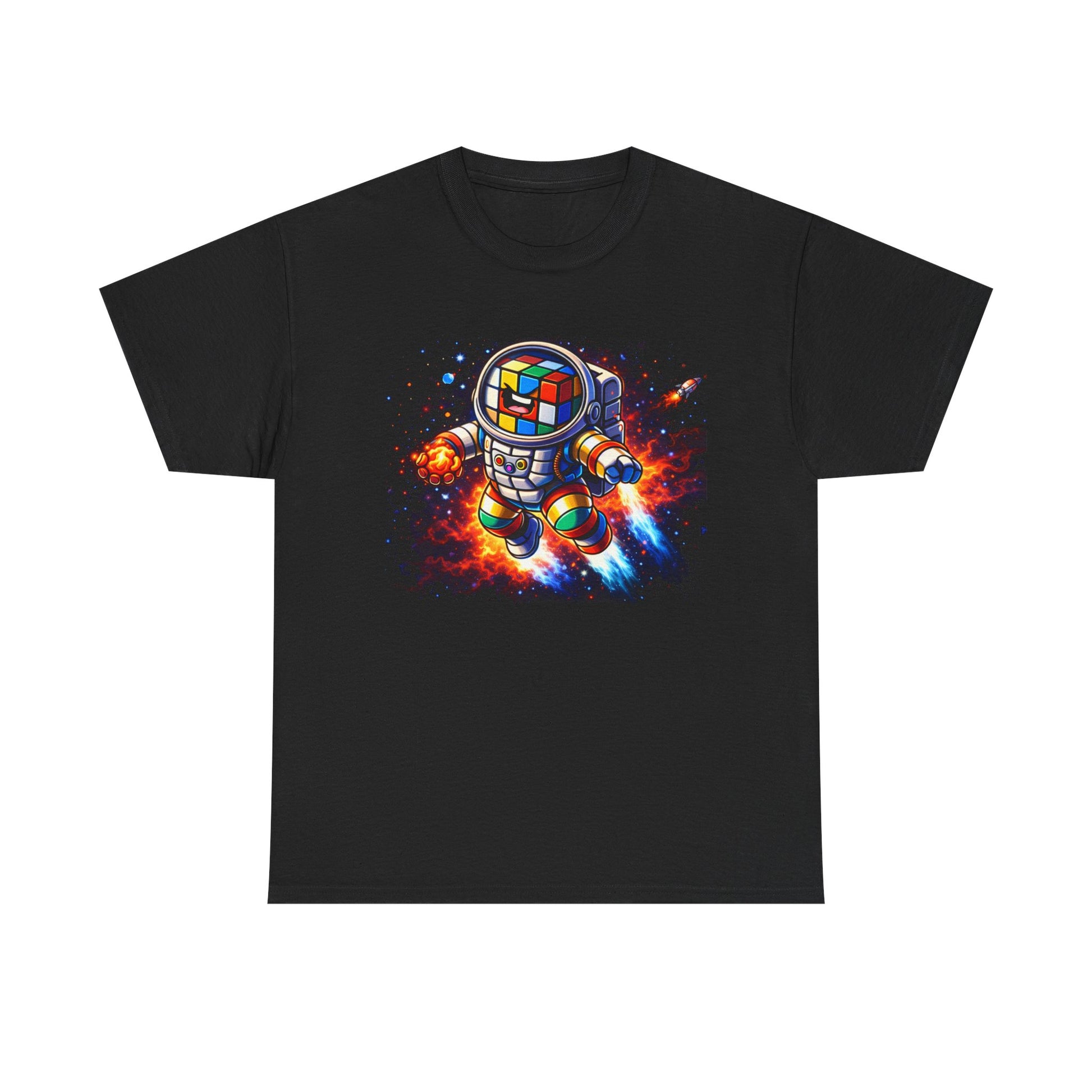 A bold, playful tee that turns a moment of cosmic wonder into wearable art. Bright, saturated inks bring an astronaut with a Rubik’s-cube helmet to life against a deep black field of stars and energetic flame — a design for people who love puzzles, retro gaming, and sci-fi energy. The classic crew silhouette and midweight 100% cotton body make it comfortable for long gaming nights, casual meetups, or strolls through comic-con crowds. Washes keep the print vivid; the ribbed collar and tubular knit keep the shape steady after many wears. Wear it when you want to spark conversation or carry a little interstellar nostalgia with you.