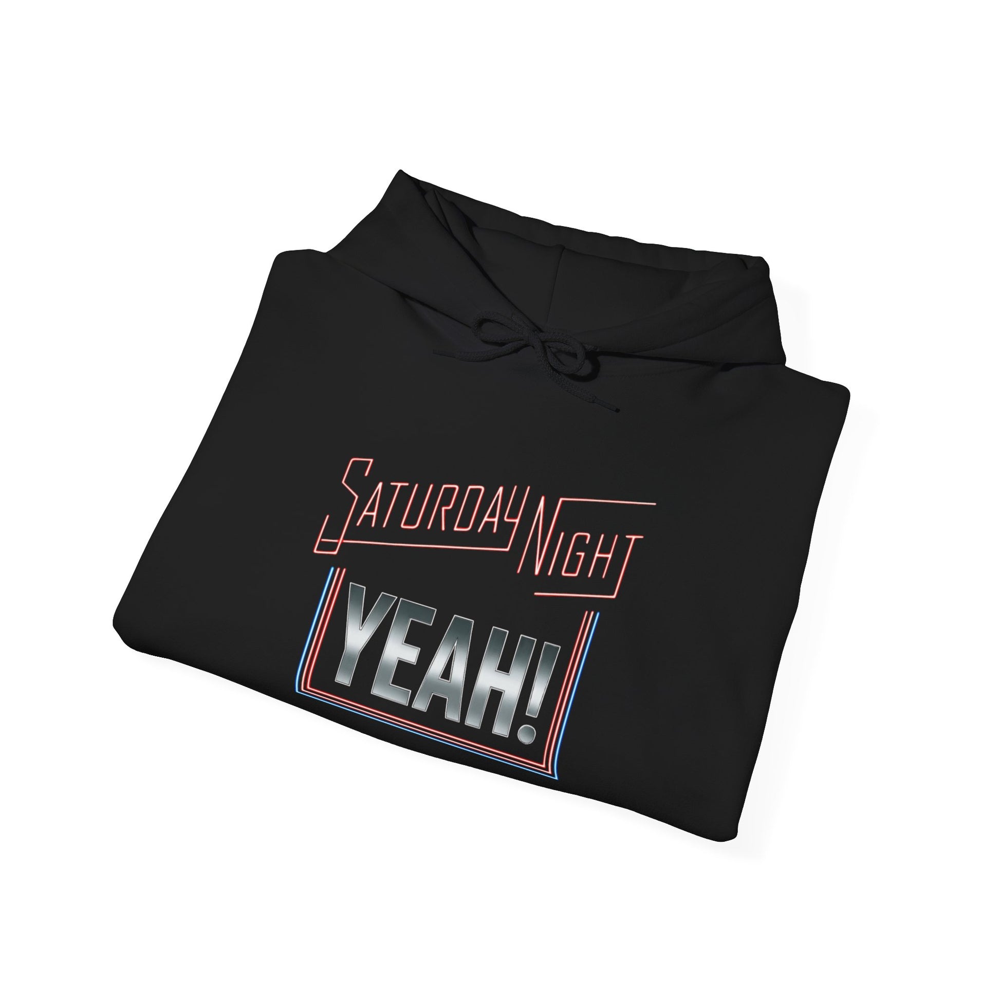 Pull on this cozy hoodie and feel the buzz of a neon-lit Saturday night. The front graphic reads “Saturday Night” in thin, vintage-style lettering above a bold, framed “YEAH!” that pops like a retro marquee. The black background makes the red, white and blue tones sing, giving the hoodie an effortless, nostalgic energy — the kind that carries you from a late rehearsal to rooftop hangs and the afterparty. Soft, slightly heavy fabric keeps the chill at bay while the kangaroo pocket and drawstring hood invite you to tuck your hands in and stay a while. Wear it with relaxed jeans or layered under a leather jacket; it’s the piece that turns casual plans into stories worth telling.