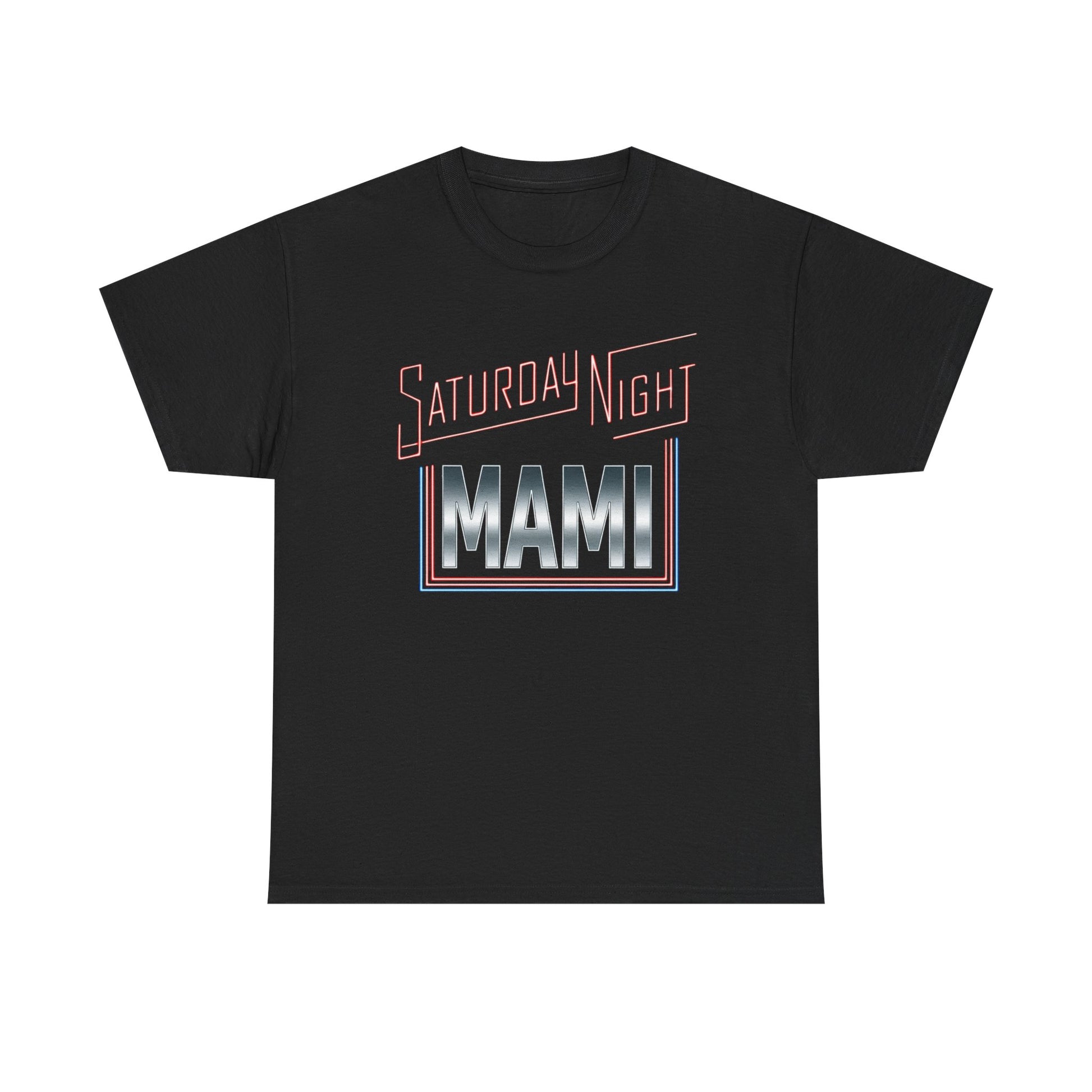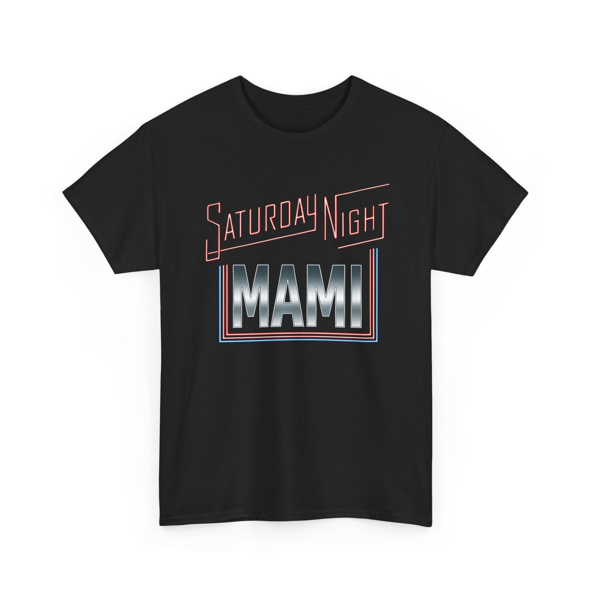 A soft, classic crew-neck tee that channels retro neon energy with a bold “Saturday Nights MAMI” graphic. The relaxed fit and smooth, sturdy cotton keep it comfortable from laid-back evenings to casual nights out. It’s the kind of shirt that settles in easily — pairs with denim, a leather jacket, or loungy joggers — and carries a confident, nostalgic mood. The graphic’s chrome-and-red palette pops against black fabric for an unmistakable vintage-club vibe that reads playful and proud.