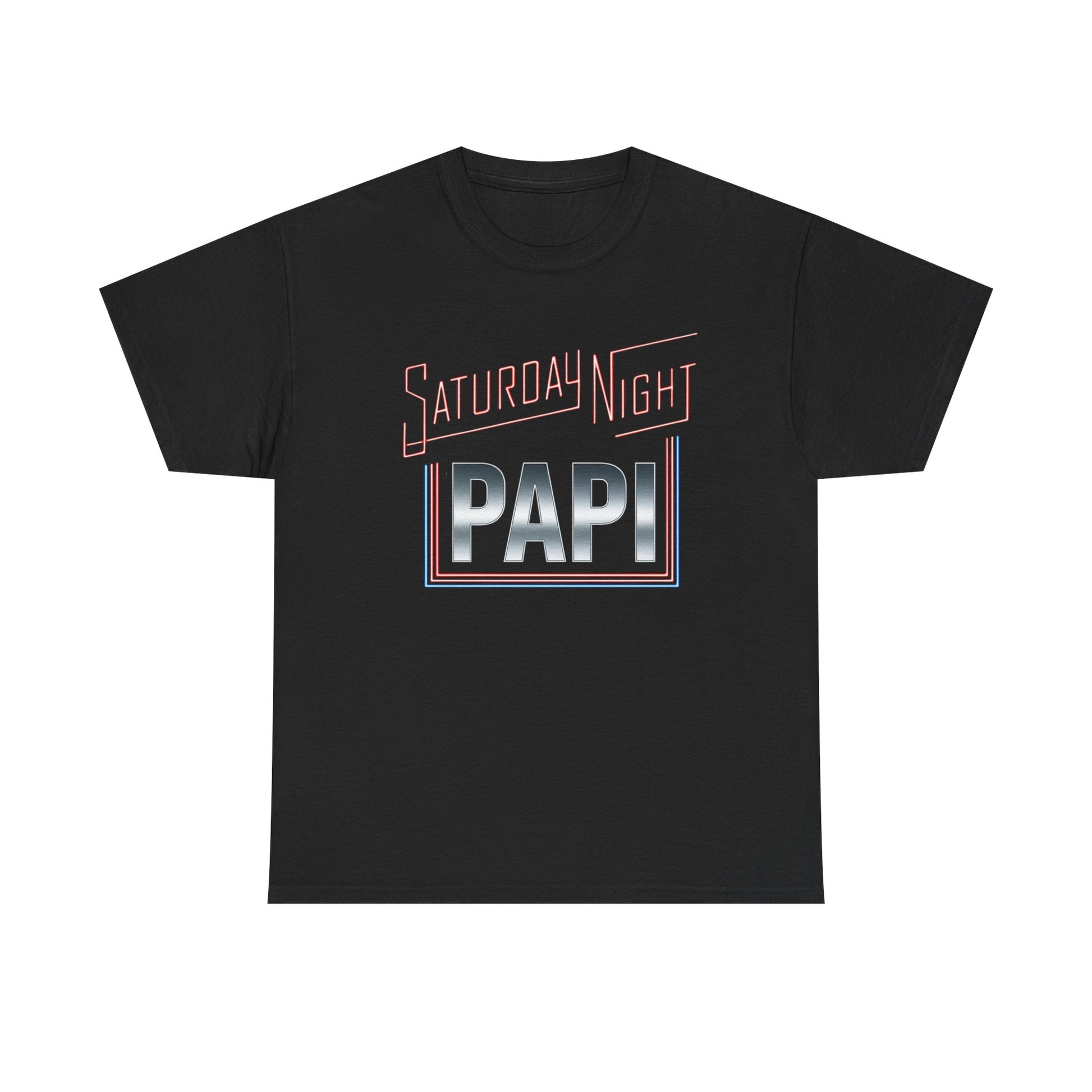A laid-back tee that carries the neon buzz of late-night streets. Bold retro lettering reads “Saturday Nights” above a chrome-finished block that declares “PAPI,” evoking club signs, laughter, and memories made under streetlamps. The shirt sits relaxed on the body with a crew neckline and classic fit — easy to wear on nights out or for casual days when you want a touch of nightlife swagger. Textures in the print catch the light for a subtle metallic sheen that feels vintage and modern at once. Finished details — like a smooth, tear-away label and reinforced shoulder tape — keep the tee comfortable and long-lasting, while the midweight cotton holds its shape and print through repeated wears and washes. This tee slips into playlists, late dinners, and rooftop hangs, becoming the go-to piece when you want to bring the Saturday night energy with you.