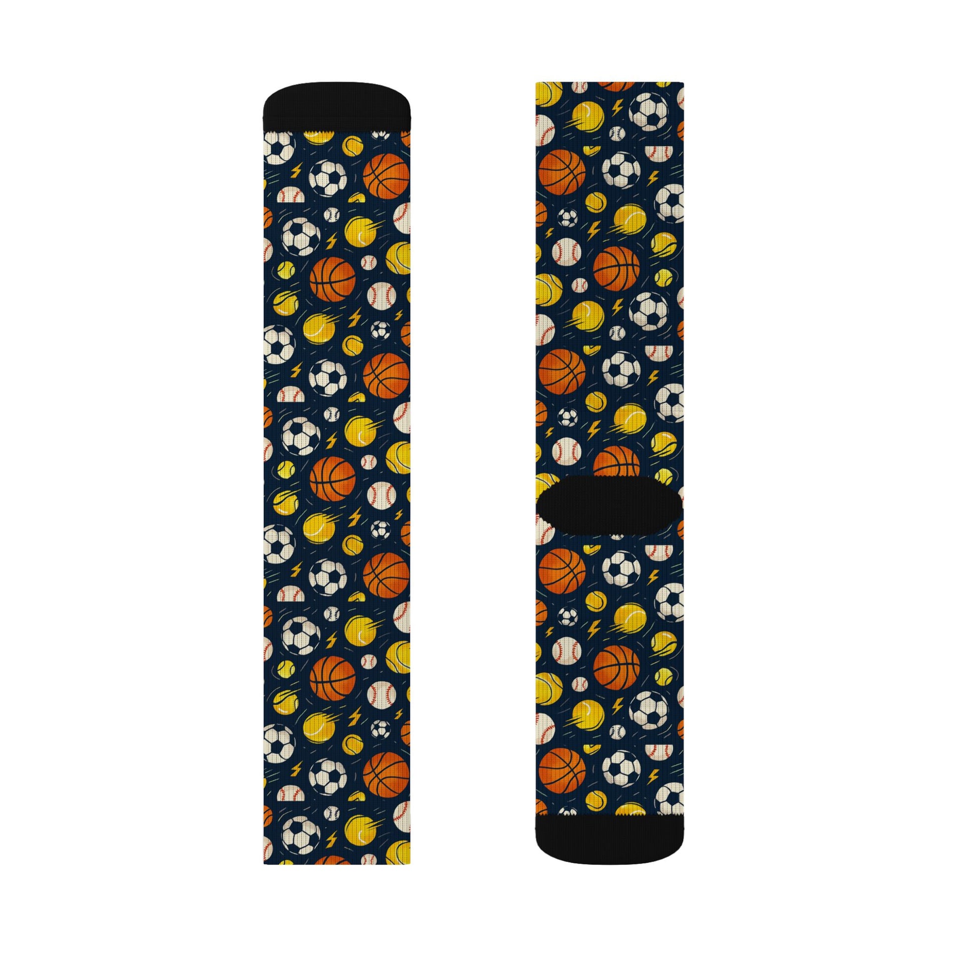 These crew-length sublimation socks bring playful energy to every step. A lively all-over sports pattern—basketballs, soccer balls, tennis balls—wraps the leg in bold color, while a soft fleece lining and cushioned bottoms keep feet warm and comfortable during long practices or game-day hangouts. The ribbed tube and regular unisex fit hold the sock in place without squeezing, and the durable polyester-spandex blend keeps the printed design vibrant through wear. Whether worn under sneakers for weekday training or with casual outfits on the weekend, they add a spirited, athletic touch to your rotation.
