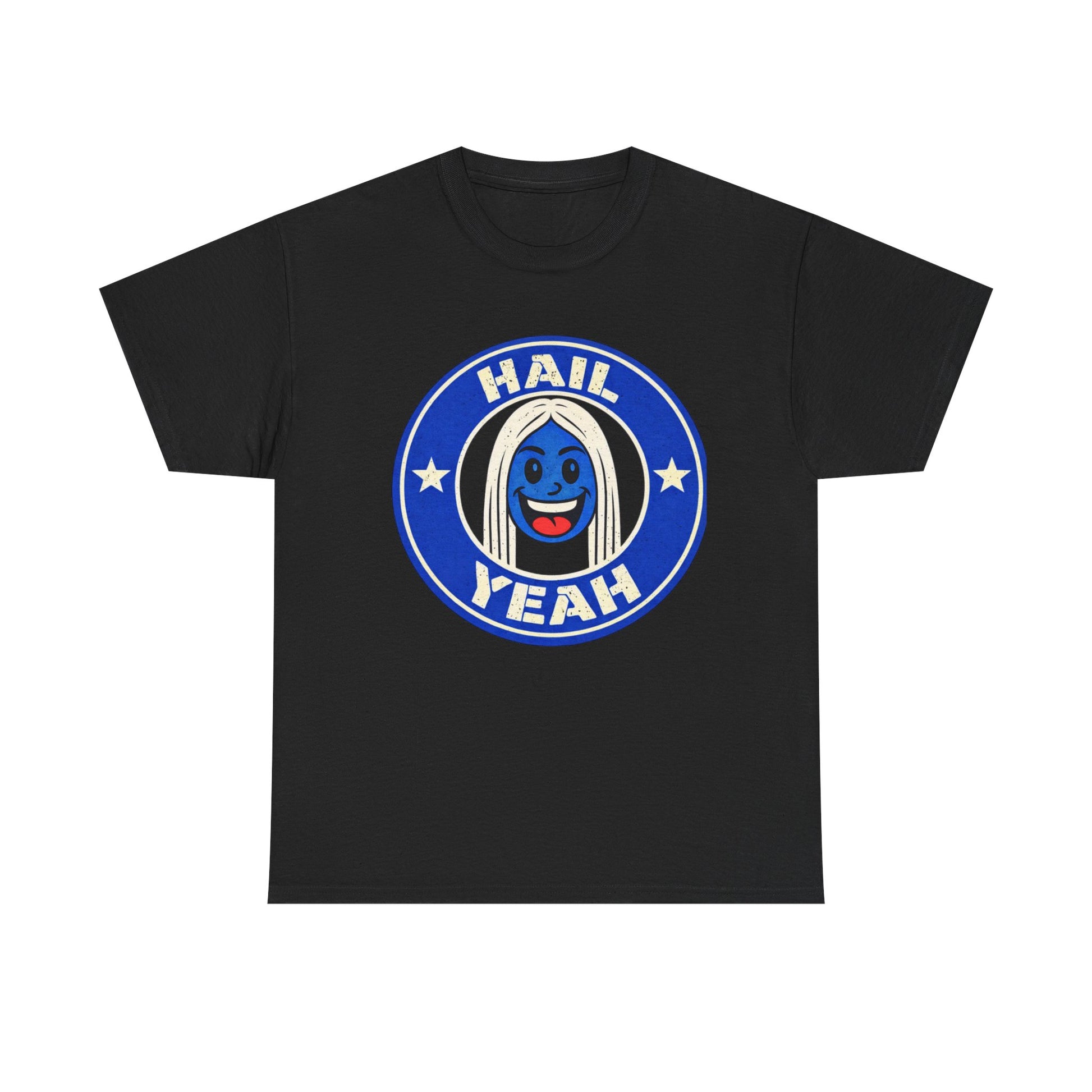 This relaxed cotton tee carries a playful, vintage-inspired badge across the chest — a smiling, blue cartoon face framed by stars and the bold slogan “Hail Yeah.” It reads like a tongue-in-cheek rallying emblem, bringing lighthearted energy to casual days and nights. The medium-weight, tubular-knit fabric holds prints well so the vibrant blue and white artwork stays crisp. Wear it while hanging out with friends, at low-key shows, or on weekend errands to add a bit of cheeky personality to an everyday outfit. The crew neckline and classic fit keep the silhouette comfortable and familiar, while the tear-away label and sturdy shoulder tape make this shirt comfortable enough to reach for first.