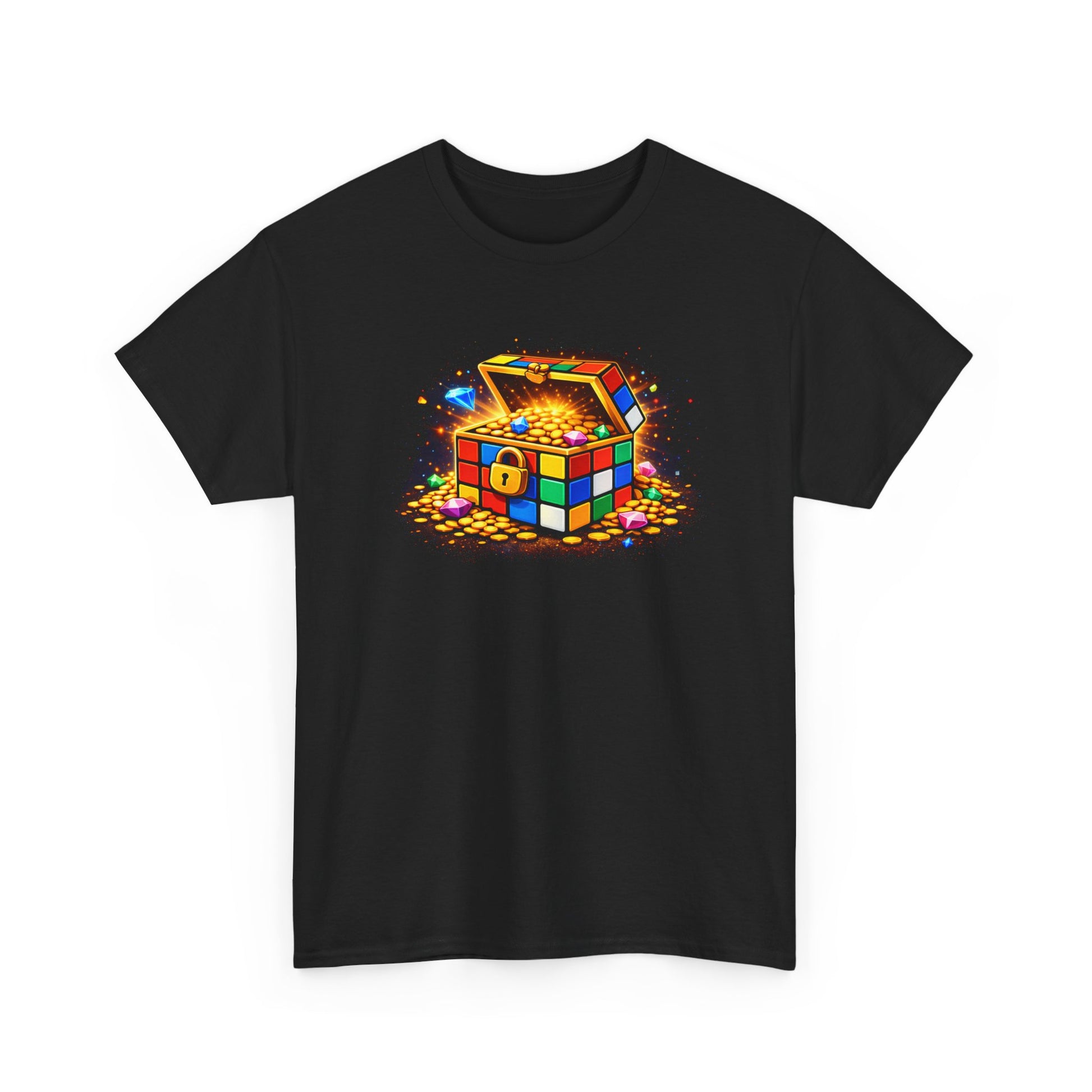 A bold, playful tee that brings puzzle nostalgia into everyday wear. The shirt centers a vibrant, jewel-bright treasure chest built from colorful cube panels — like a Rubik’s Cube turned pirate booty — with gold coins and sparkles spilling out. It feels like the moment when a long solve finally clicks: bright, celebratory, and a little mischievous. Wear it to casual meetups, game nights, or when you want to add a pop of color to your rotation. The classic crew neck and relaxed fit let the design sit front-and-center, while the sturdy cotton holds prints with crisp detail and a soft hand against the skin.